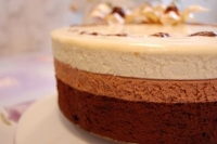 Торт-суфле "3 шоколада" (состоит из одного шоколадного бисквитного коржа и трех слоев суфле с тремя разными вкусами шоколада.) В этом торте количество слоев и вкусов шоколада можно менять, вкус торта не пострадает. |